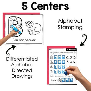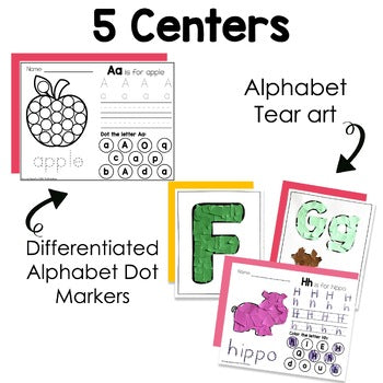 These are NO PREP alphabet centers. Simply print and go! Students will be engaged with using stamps, bingo dotters, tearing paper or drawing their own alphabet animals with shapes only.