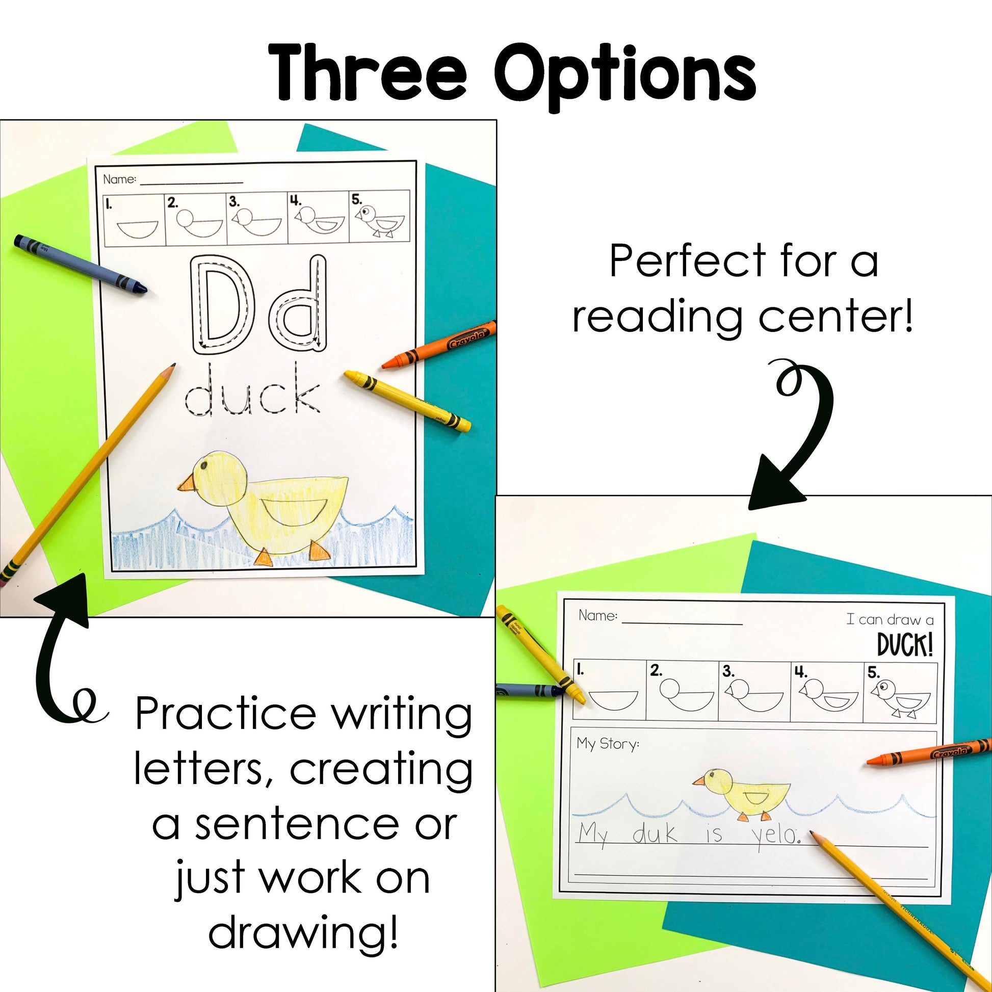 - Option Two: Use as a reading/craft center. Students will draw the picture and create a sentence to match it. Blank lines AND handwriting lines available.