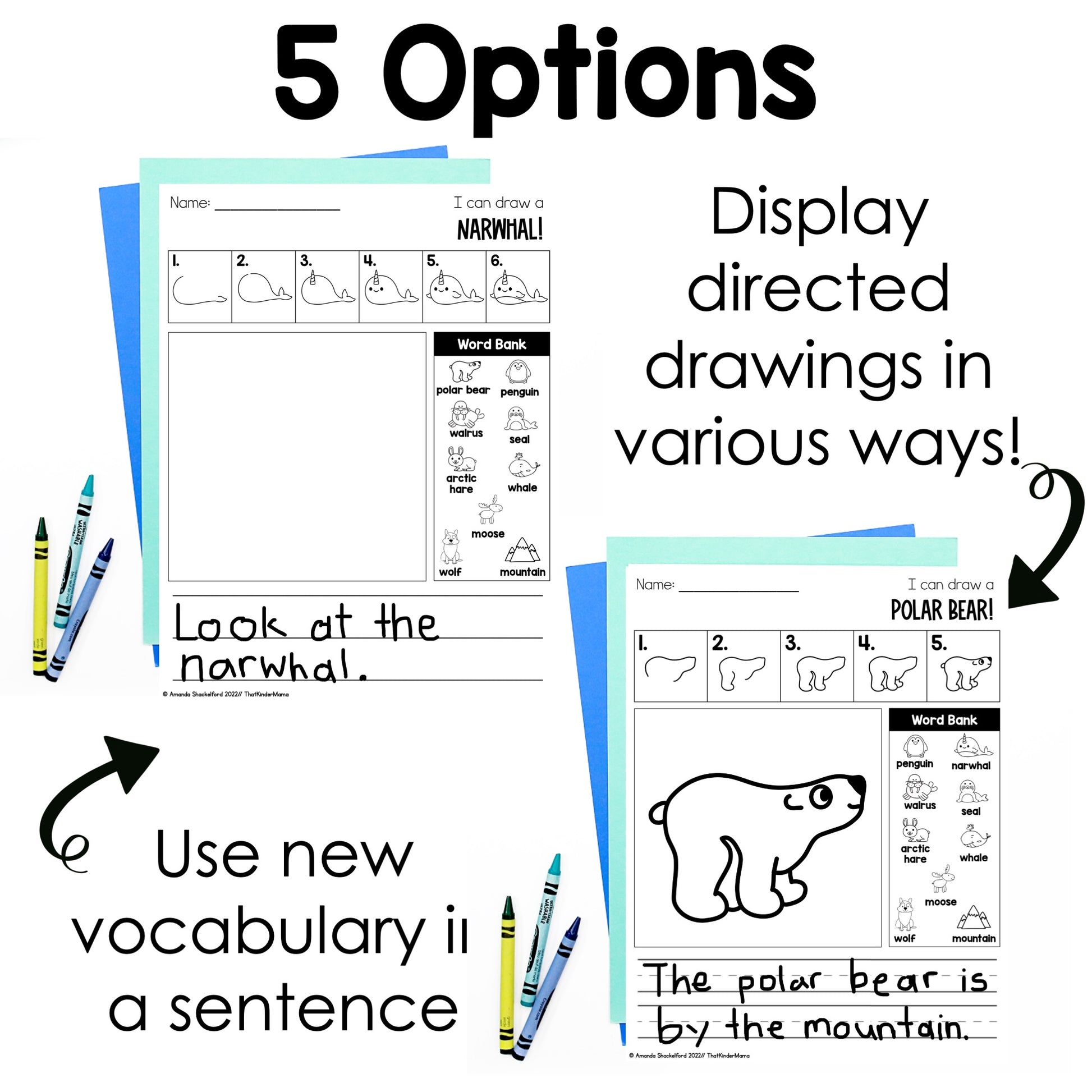 - Directed Drawings used: polar bear, penguin, walrus, whale, wolf, moose, narwhal, seal, arctic hare, mountains