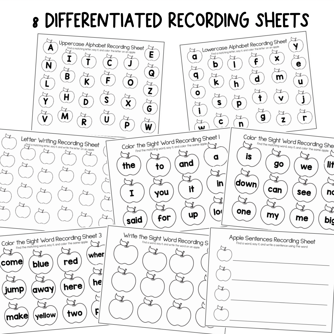 •Place letters/sight words in a tub. Have students pull one card out at a time and record on their sheet. Students may work on this independently or as a literacy center.