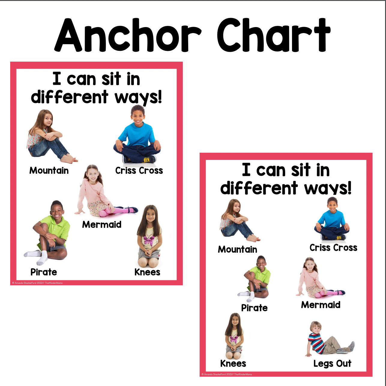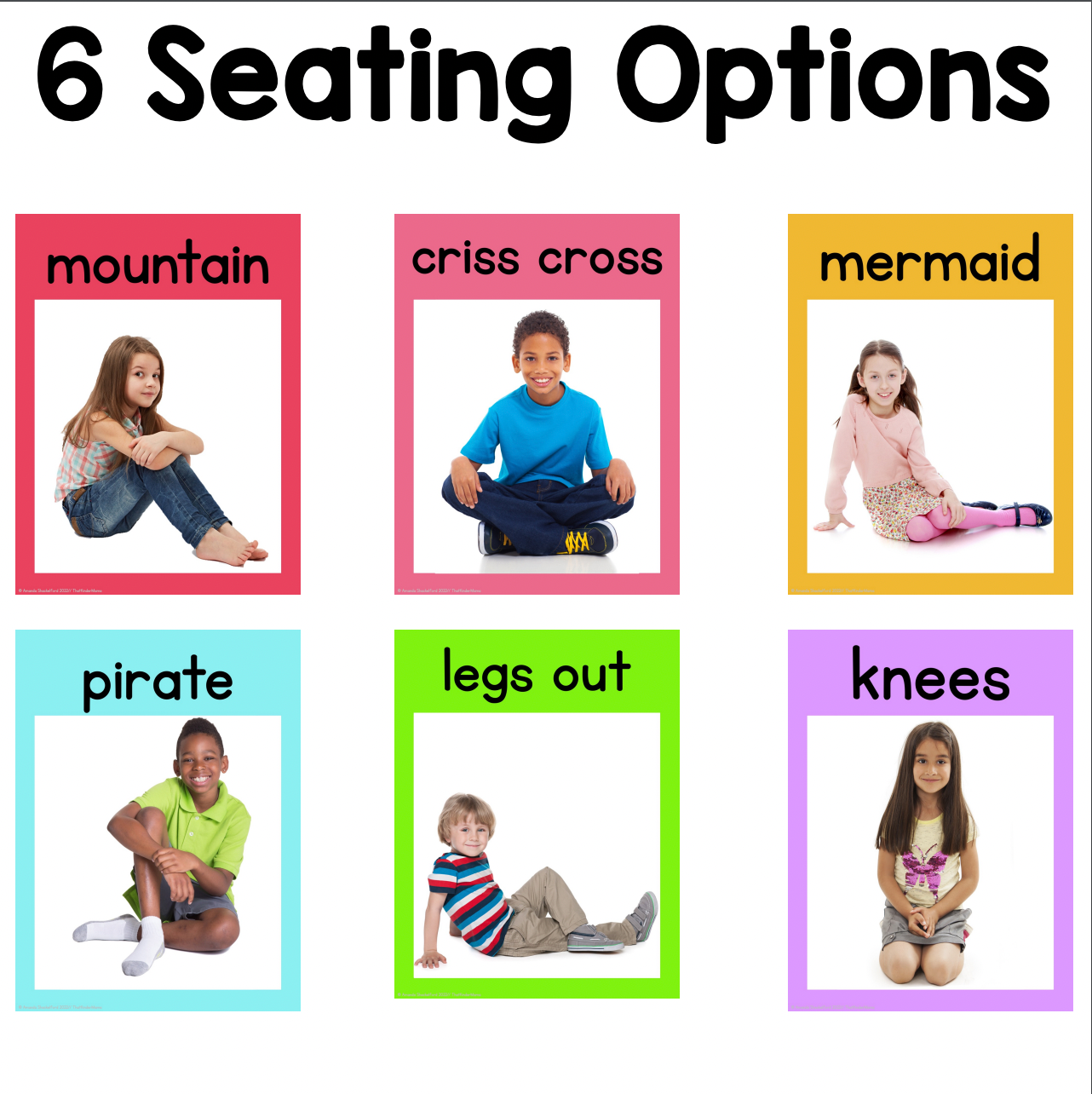 - 1 anchor chart of all the sitting options together (you can print this as a huge poster to keep by the front of your whole group learning area)