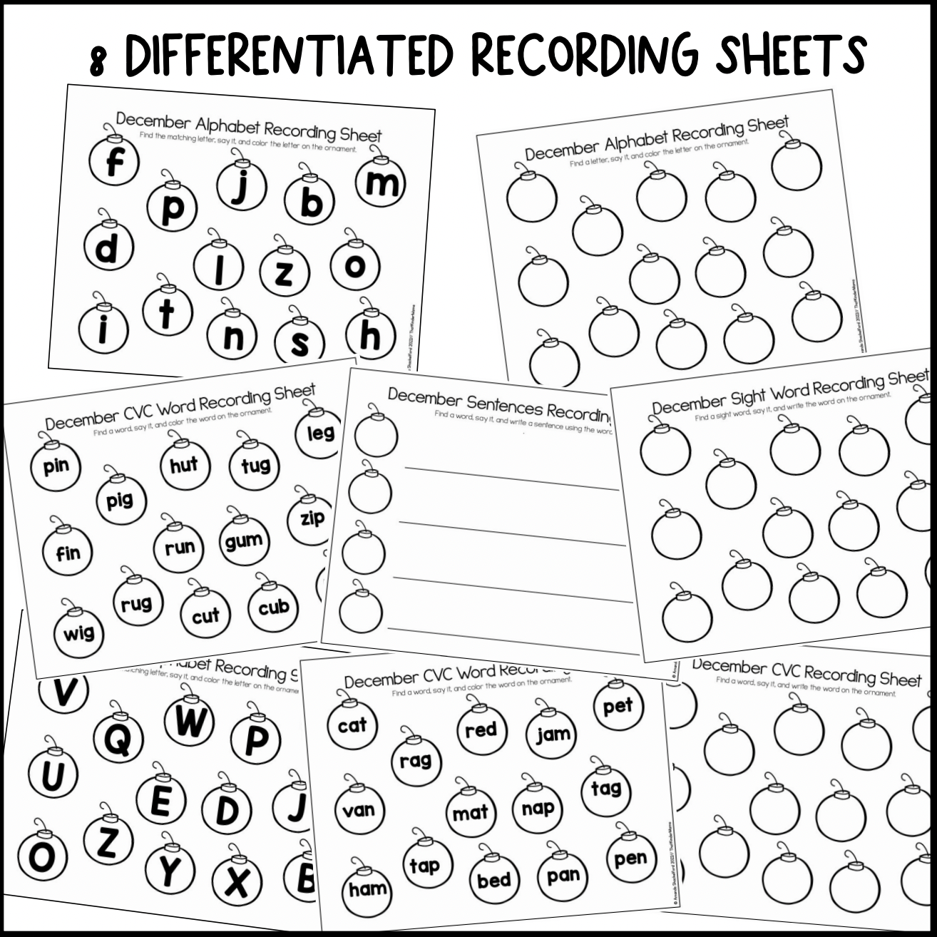This is a differentiated December/winter sensory bin reading center. Students can practice alphabet letters, sight words, sentence writing, and CVC words with this differentiated literacy activity.