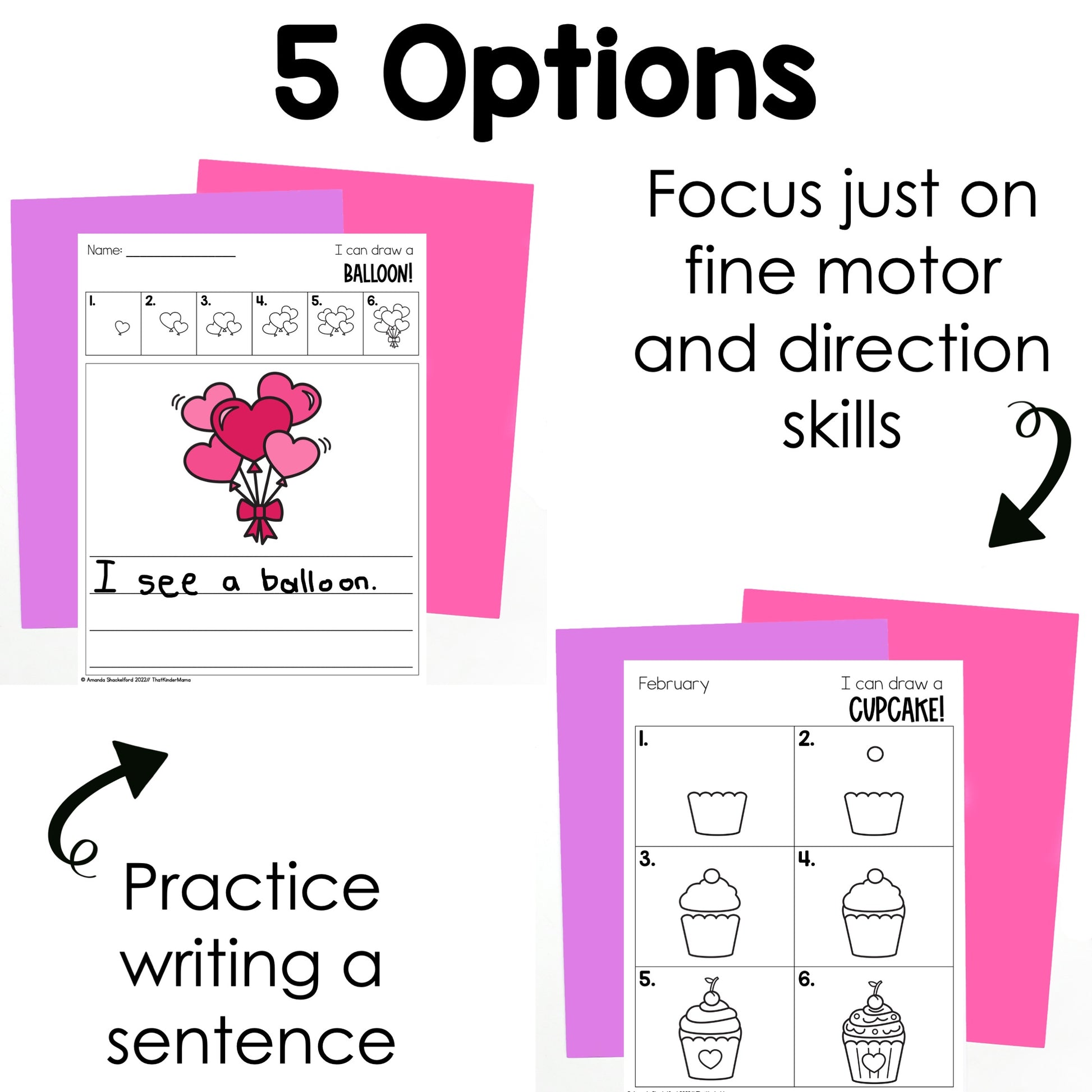 These are February directed drawings. Perfect for kindergarten students to continue gaining confidence in their drawing abilities while also practicing fine motor skills, following directions, sentence writing or building vocabulary. Add these directed drawings to your reading or craft centers to give your students hand on experiences.