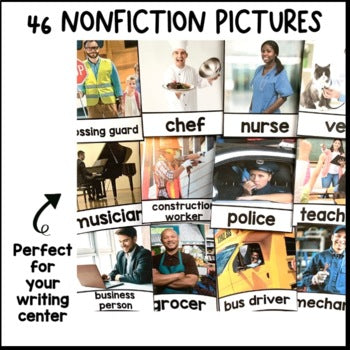These are various activities to complete your Community Helper unit. Your students will be exposed to 46 nonfiction pictures of community helpers, learn about 8 community helpers by completing a bubble map and their own nonfiction book along with various literacy, writing and craft activities.
