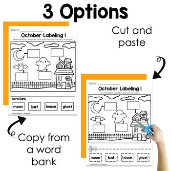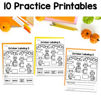 These are no prep, October labeling printables you can use with your kindergarten students to practice labeling pictures. Students can focus solely on the skill of labeling without worrying about additional steps in the writing process. It is a perfect companion to your fall or October reading centers.