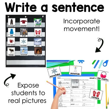 These are differentiated January reading centers for the kindergarten classroom. Students can review letters/sounds, sentence structure, writing a sentence, labeling and drawing all winter long!