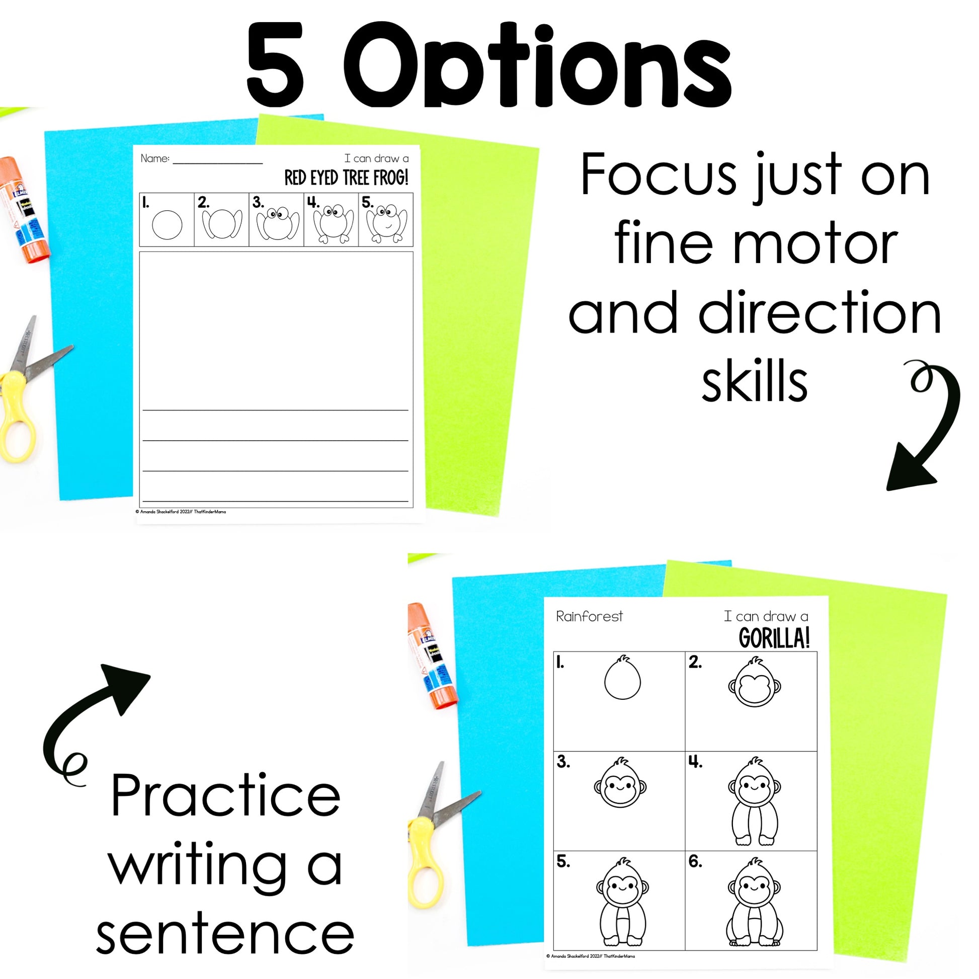 These are Rainforest Directed Drawings. Perfect for kindergarten students to continue gaining confidence in their drawing abilities while also practicing fine motor skills, following directions, sentence writing or building vocabulary. Add these directed drawings to your reading or craft centers to give your students hand on experiences.