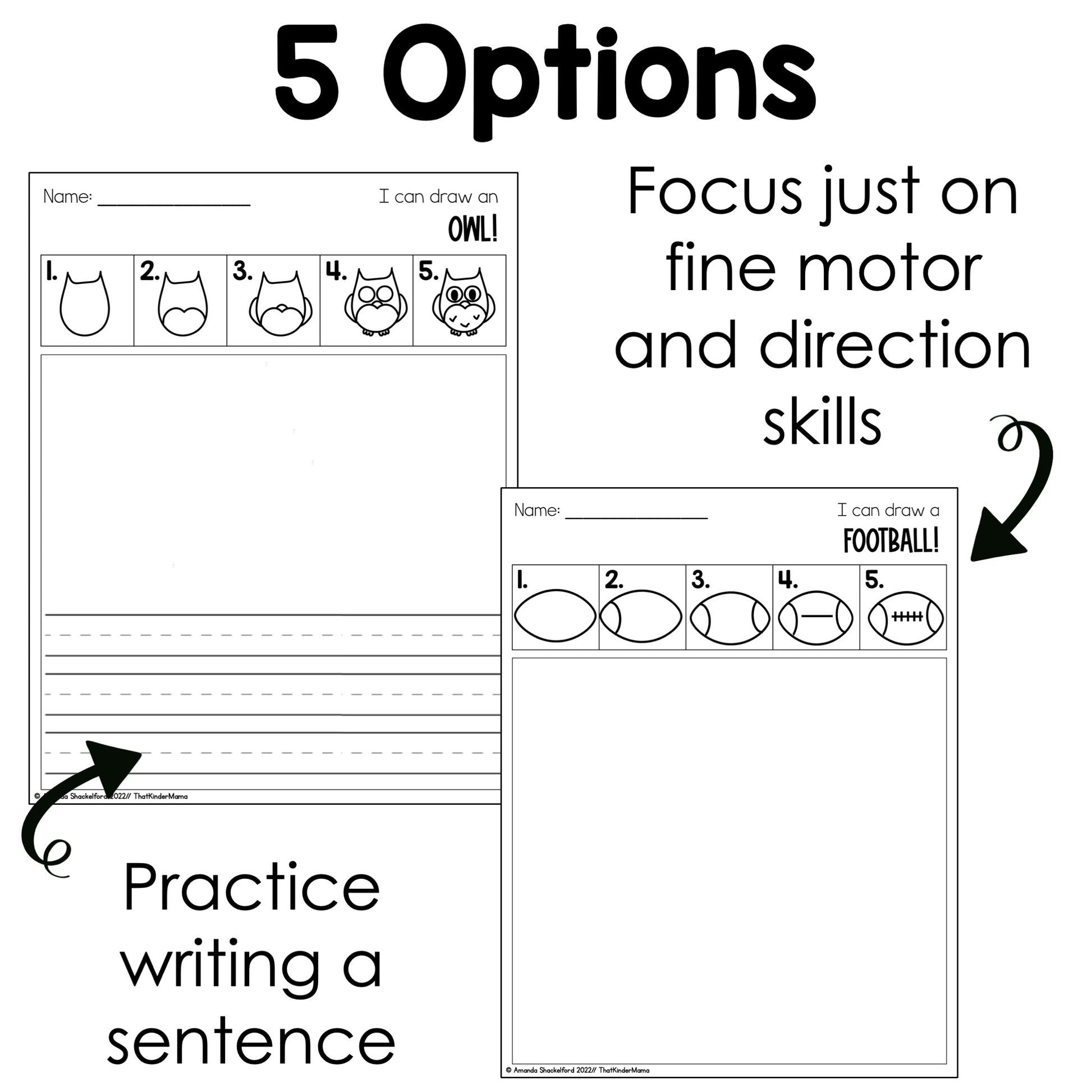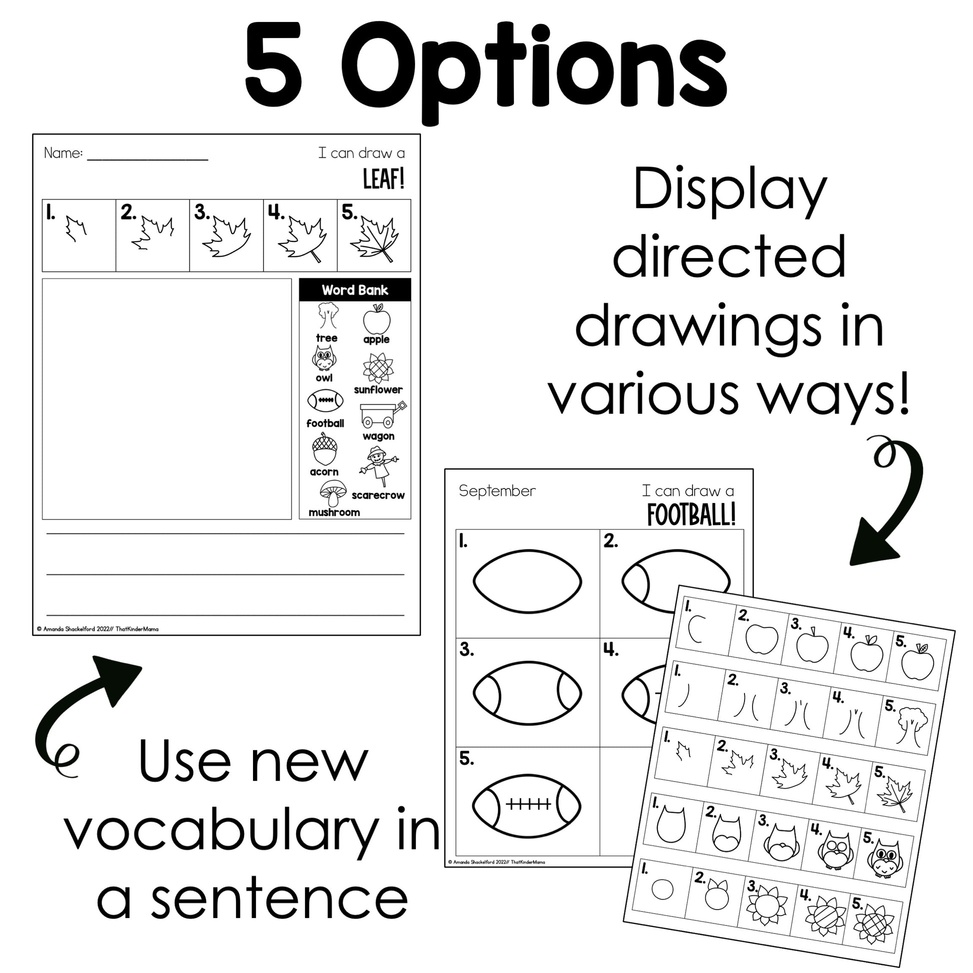 - Option Two: Students draw the directed drawing AND write a sentence (blank and handwriting lines available)