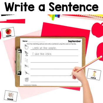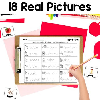 This is a September Write the Room themed writing center with nonfiction, real photographs. Use these fall, apple words in your kindergarten or primary classroom to keep your students engaged during reading centers.