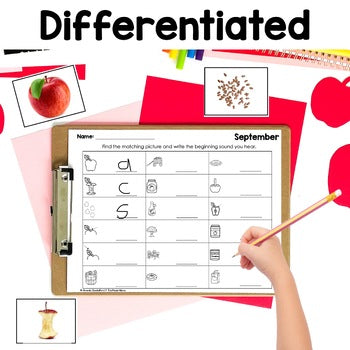 - 4 differentiated worksheets: Write the word, trace the word, write the beginning sound, and write a sentence