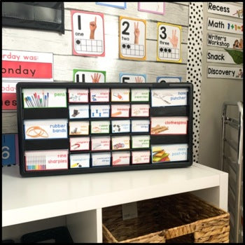 These labels were created with the Akro-Mill 26 Drawer Teacher Toolbox. It can be found on Amazon here: https://amzn.to/3aQyMtM